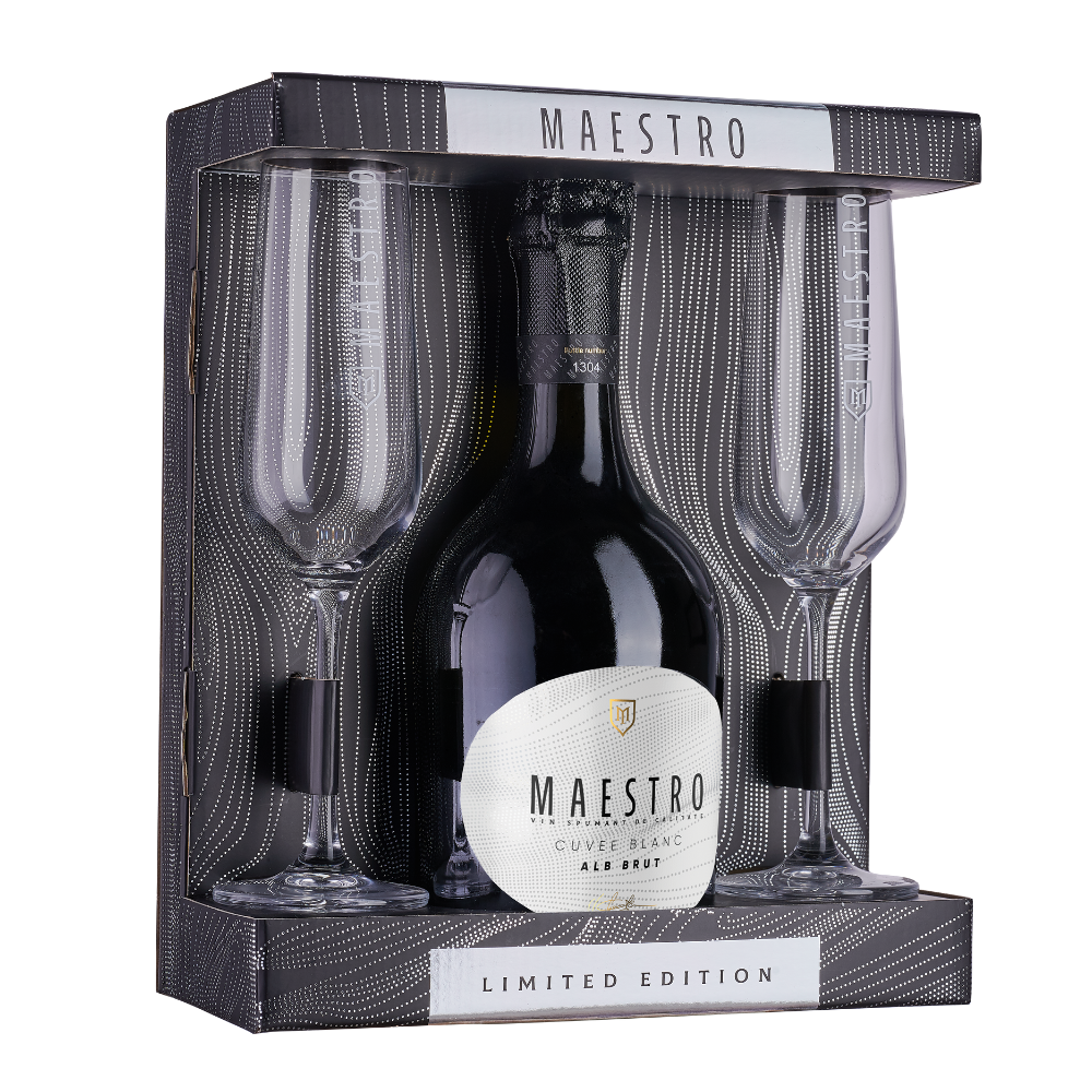 Setul este completat de două pahare elegante, create pentru a evidenția perlajul fin și aromele spumantului, toate ambalate într-o cutie cadou premium, ideală pentru a fi oferită cuiva drag sau pentru momente speciale.