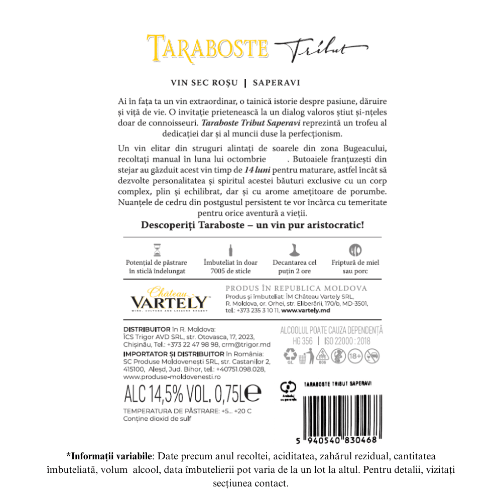 Chateau Vartely Taraboste Tribut Saperavi 2018 – Vin Roșu Sec 0.75L