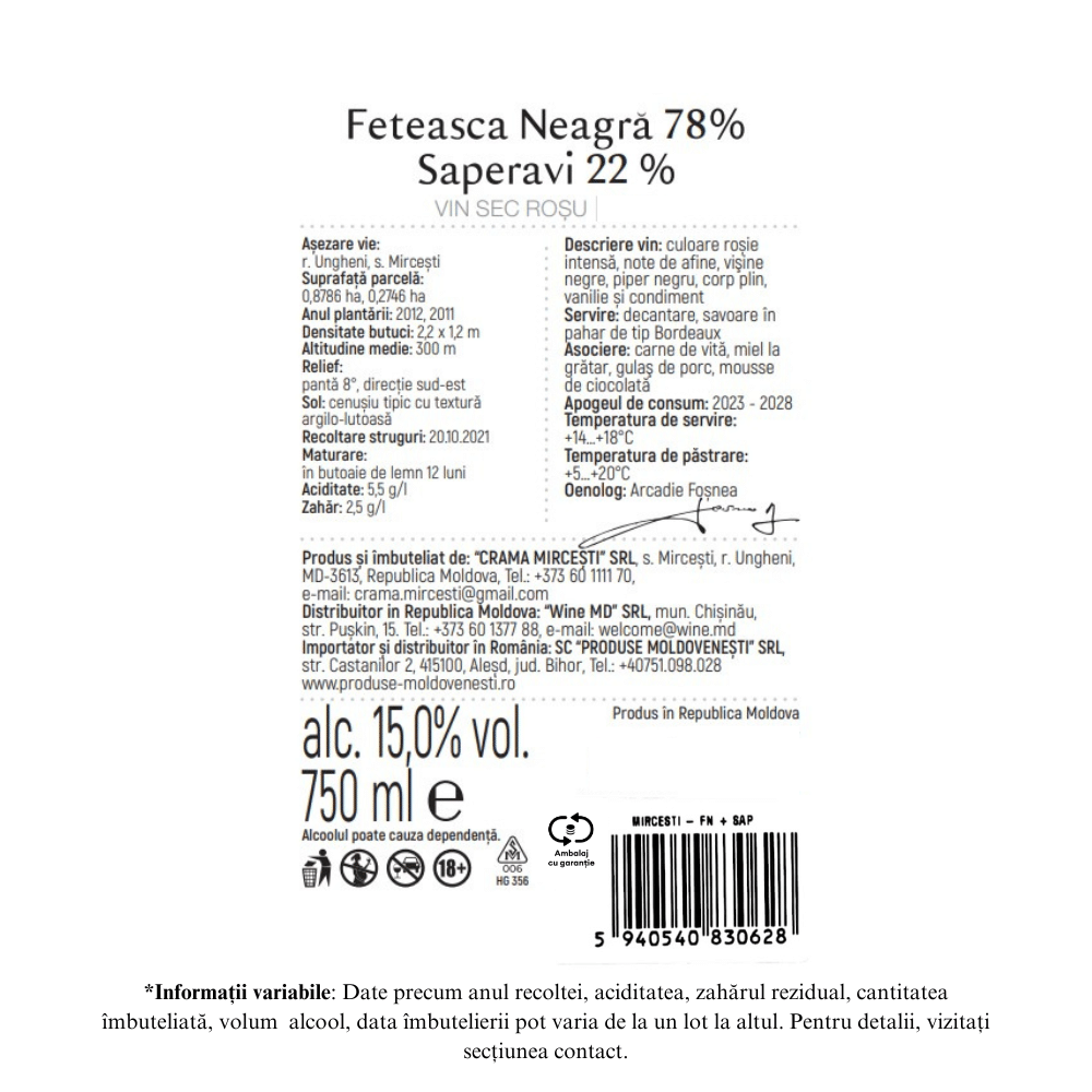 Crama Mircesti Feteasca Neagra & Saperavi: Vin Rosu Sec 0.75L