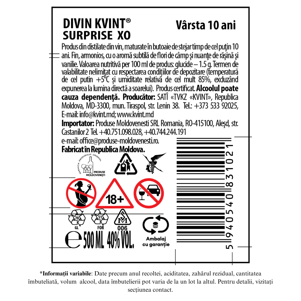 Kvint XO 10 etalează un caracter sublim în pahar. Sortimentul are la baza soiuri precum Bianca, Aligote, Pervenets de Magarach, Riesling, Riton, Suruchensky Alb şi Ugni Blanc. Maturat minimum 10 ani.