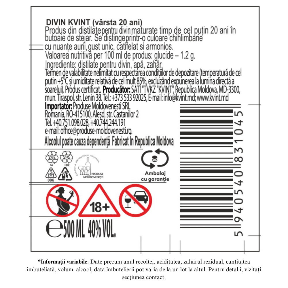 Medaliat cu argint la International Wine Challenge 2014 UK, Kvint Divin XO 20 de ani etalează un buchet absolut seducător, semn al calităţii şi atenţiei pe care producătorii o acordă fiecărui detaliu. Sortimentul este compus din distilate de vin învechite pe o perioadă de minimum 20 de ani în butoaie din lemn de stejar, acestea având la bază soiuri de struguri precum Pervenets de Magarach, Bianca, Aligote, Riesling, Suruchensky Alb, Riton şi Ugni Blanc. Savuraţi Kvint Divin Xo 20 ani la o temperatură ideală de 20-22 °С, servit în pahare cu picior scurt şi cupă cu bază lată, îngustată spre partea superioară. Un aperitiv pe bază de brânzeturi şi măsline acompaniază excelent degustarea.