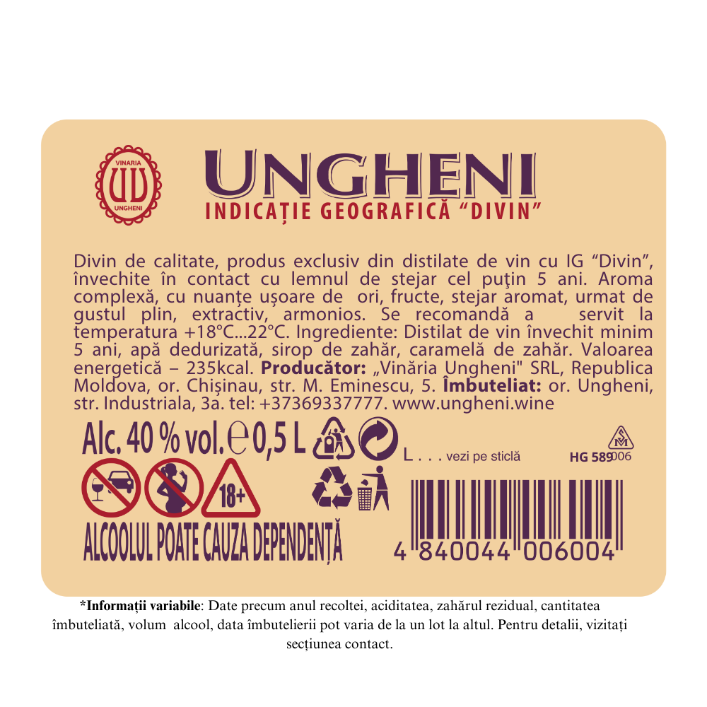 Divinul „Ungheni” 5 ani este o băutură nobilă, obținută din distilate de vin maturate în butoaie de stejar timp de 5 ani. Produsul reflectă tradiția și măiestria distilării, oferind o experiență gustativă autentică, perfectă pentru momente speciale. Arome