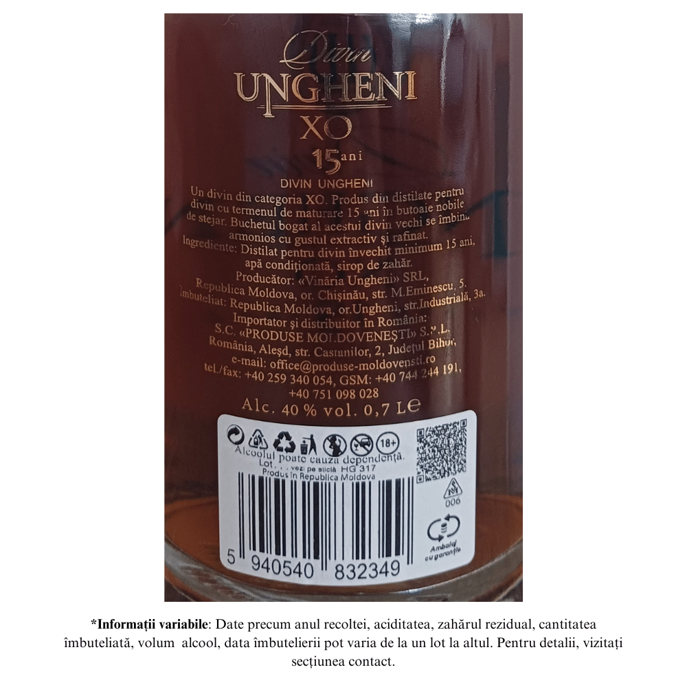 Acest Divin XO este produs la Vinăria Ungheni cu o vechime de 15 ani, fiind maturat în butoaie de stejar. Are o culoare de chihlimbar și o aromă deosebită.