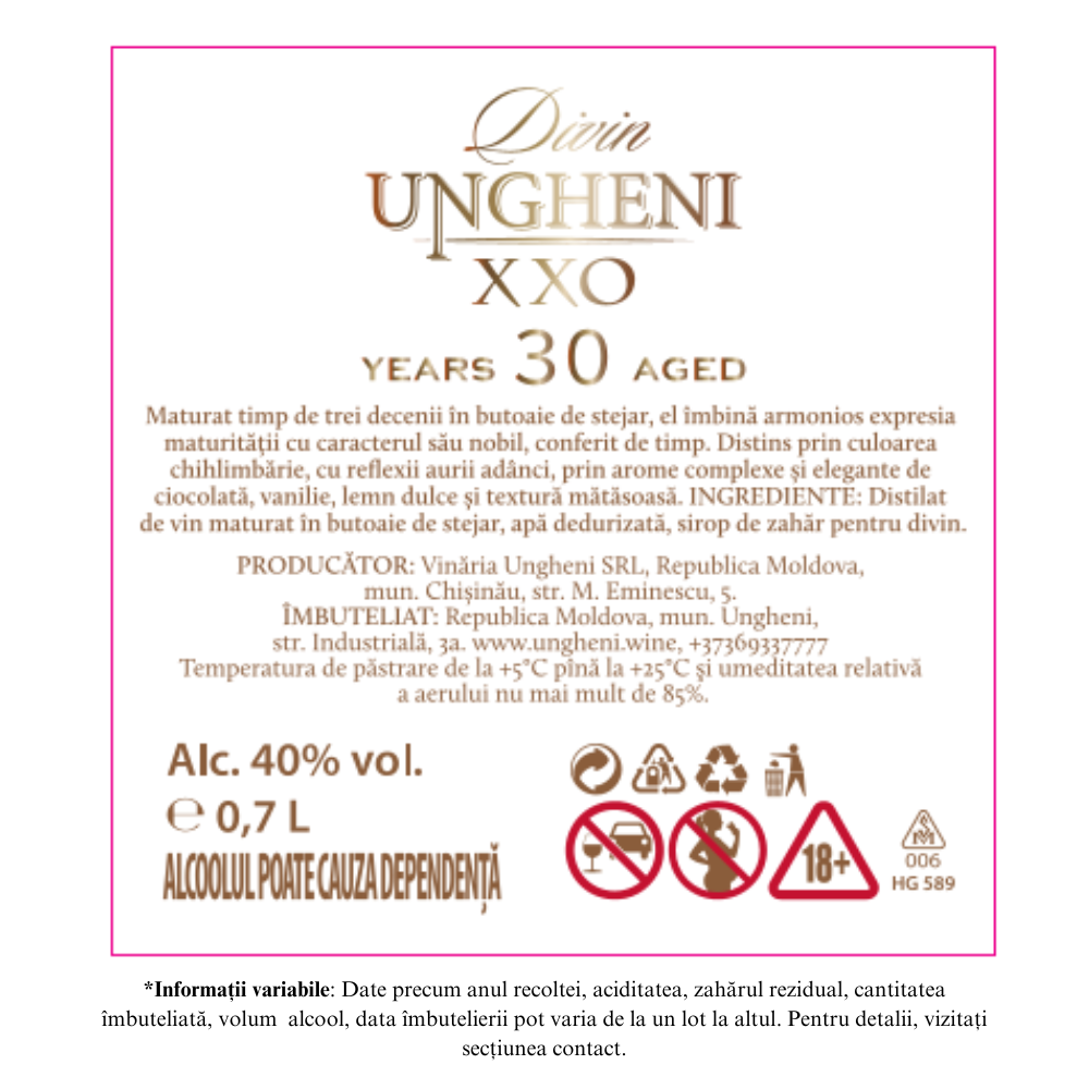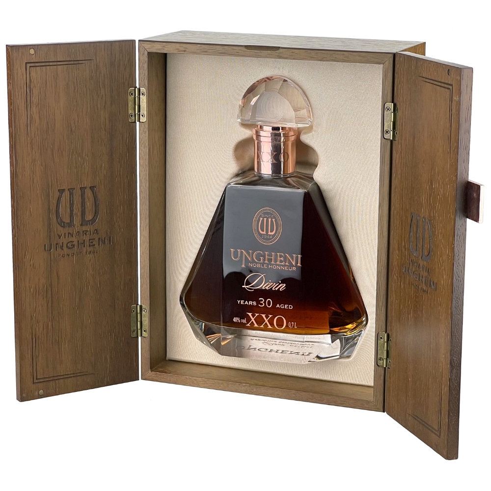 Maturat timp de trei decenii în butoaie de stejar, el îmbină armonios expresia maturității cu caracterul său nobil, conferit de timp. Distins prin culoarea chihlimbărie, cu reflexii aurii adânci, prin arome complexe și elegante de ciocolată, vanilie, lemn dulce ulce și textură mătăsoasă. INGREDIENTE: Distilat de vin maturat în butoaie de stejar, apă dedurizată, sirop de zahăr pentru divin.