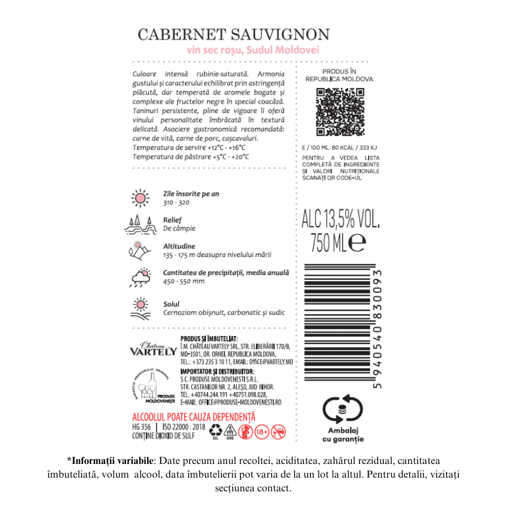 Vin rosu sec, din soi de struguri selectionati Cabernet Sauvignon, culesi in zona de sud a Moldovei Bugeac, (Valulul lui Traian), fiind cea mai prielnica din punct de vedere climateric, pentru obtinerea vinurilor rosii. Vinul prezinta o concentratie de culoare si arome intr-o combinatie perfecta, cu un gust expresiv echilibrat, armonios, dominat de taninurile proaspete, aproape crocante, dar atat de tipice soiului.