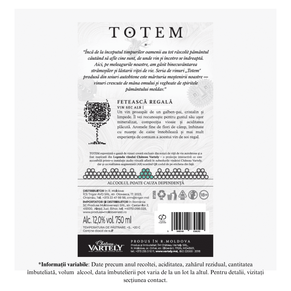 FETEASCA REGALA – Un vin proaspat cristalin si limpede, de un galben-pai stralucitor. Il vei recunoaste pentru gustul sau usor mineral, compozitia vioaie si aciditatea placuta. Aromele fine de flori de camp, imbinate cu nuante de caise innobileaza si mai mult experienta de consum a acestui vin de soi regal. O senzatie fresh bine sustinuta de mineralitatea moderata ne insoteste pana la final, oferind astfel o placere incomparabila.