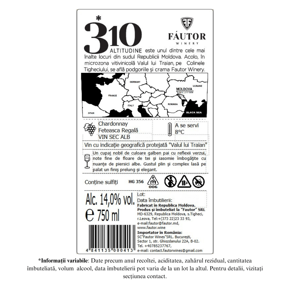 Un cupaj nobil de culoare galben pai cu reflexii verzui, note fine de floare de tei și iasomie îmbogățite cu nuanțe pe piersici albe. Gustul plin și complex lasă pe palat un finiș prelung și elegant.