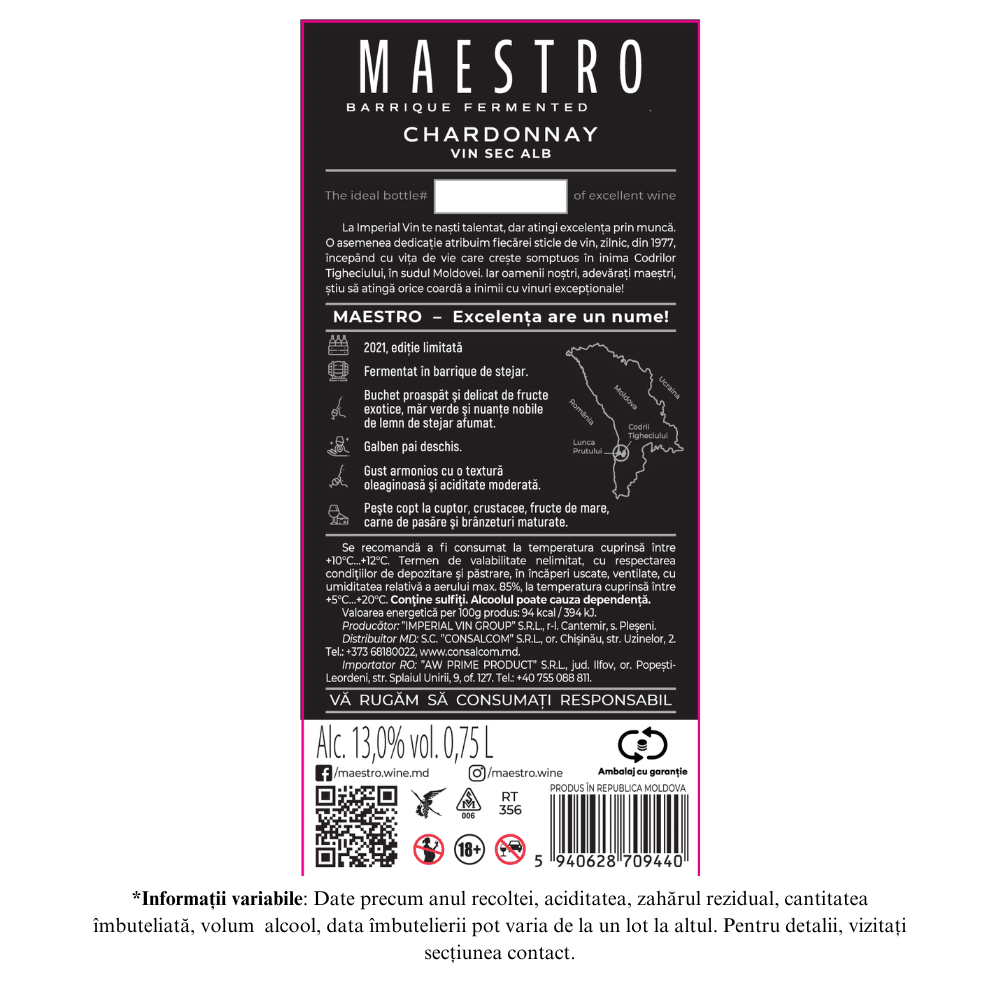 Un Chardonnay curajos, fermentat in baric, cu un buchet proaspat de fructe exotice, mar verde si nuante nobile de lemn de stejar afumat. Are un gust armonios si aciditate moderata.