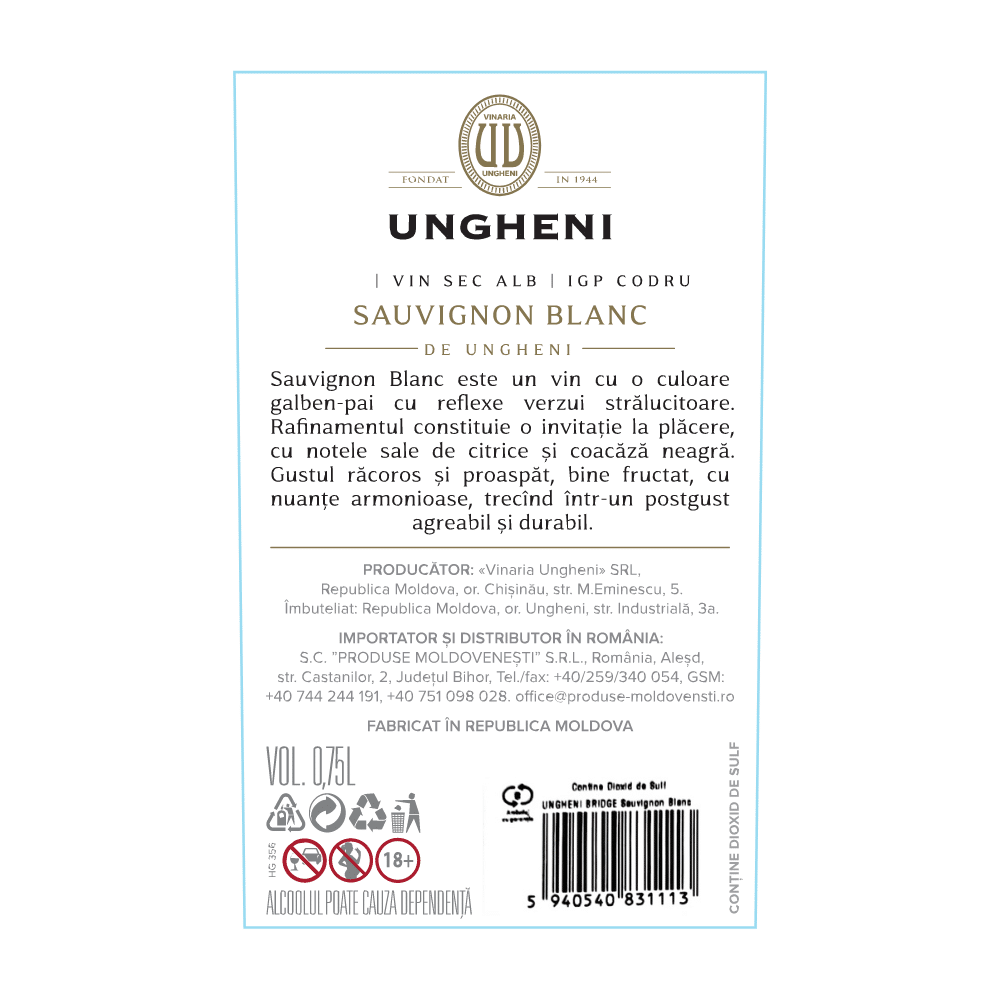 Vin UNGHENI Bridge Sauvignon Blanc Alb Sec 0,75L