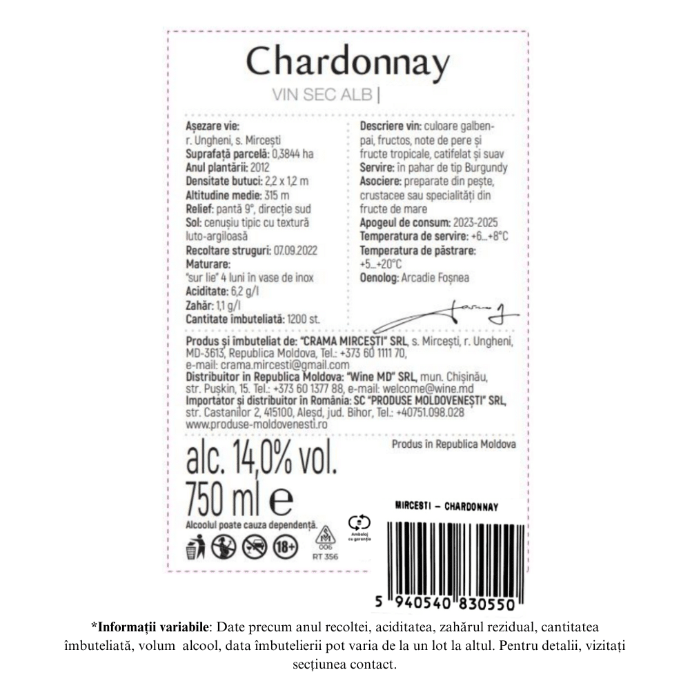 Acest vin alb sec conține 100% Chardonnay cules și produs la Crama Mircești.