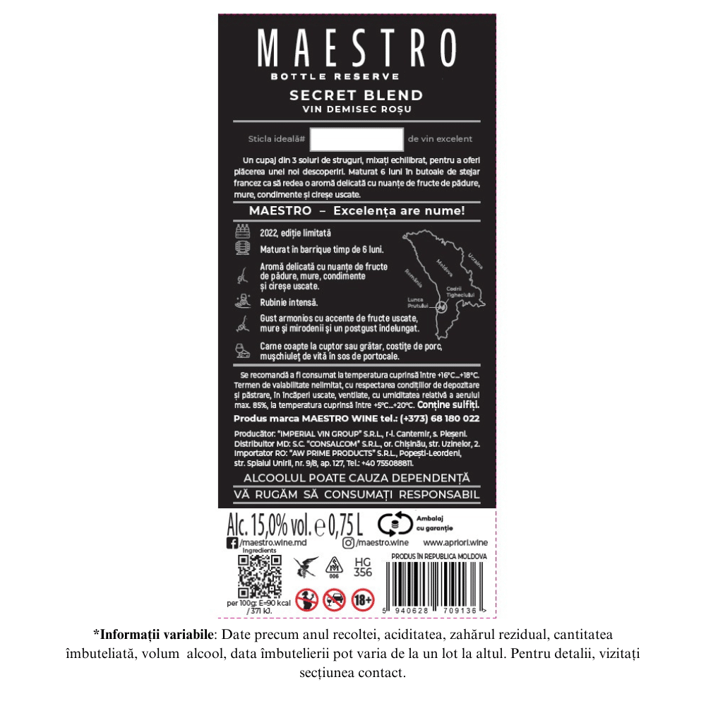 Îmbinând talentul, curajul și trei soiuri de struguri supracoapte, am creat acest Secret Blend, un vin care se dezvăluie treptat, învăluit în mister. Fiecare înghițitură te poartă într-o călătorie de gusturi și arome, invitându-te să descoperi complexitatea sa.