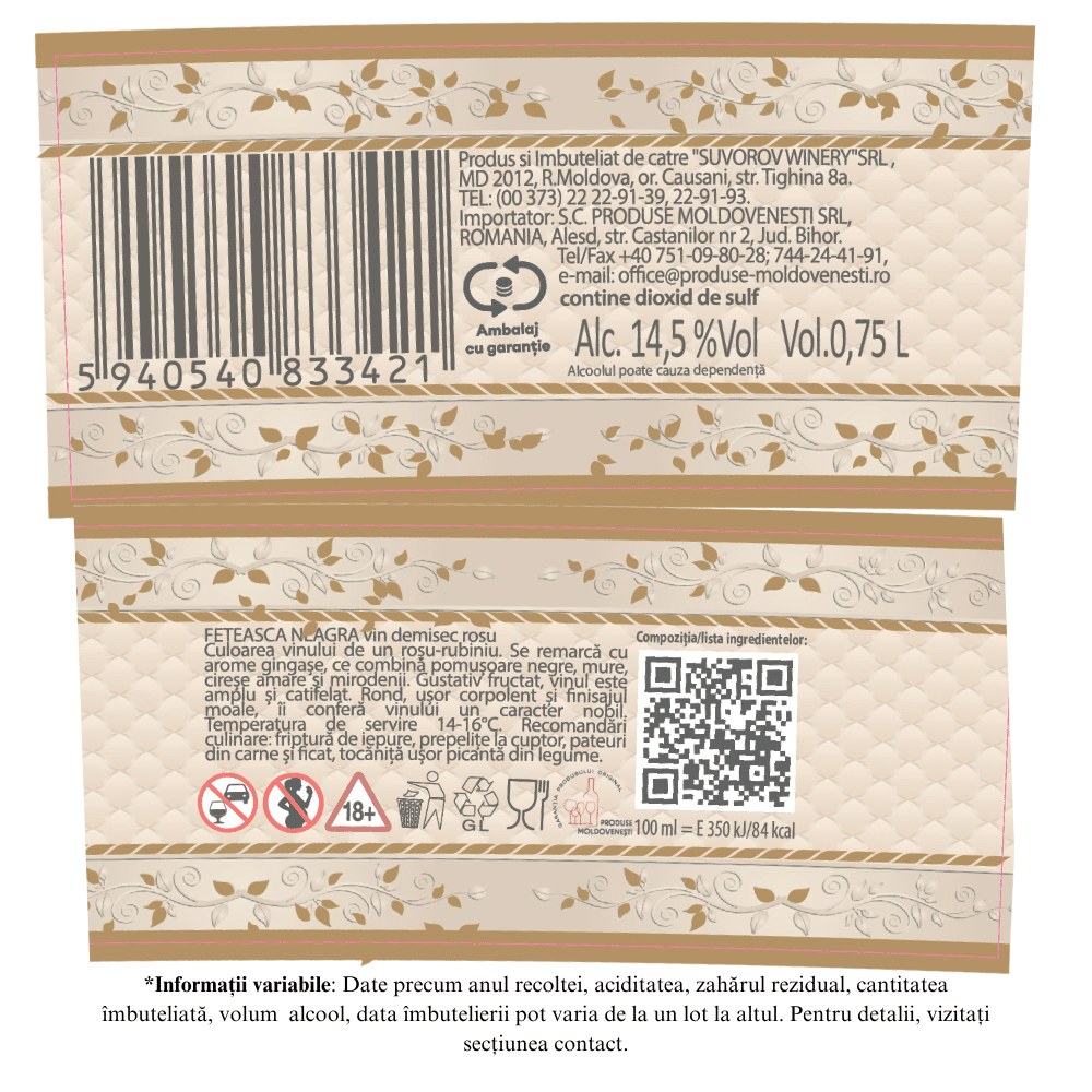 Vin demisec rosu, produs din struguri de Feteasca Neagra, cultivati in regiunea Stefan-Voda a Republicii Moldova.