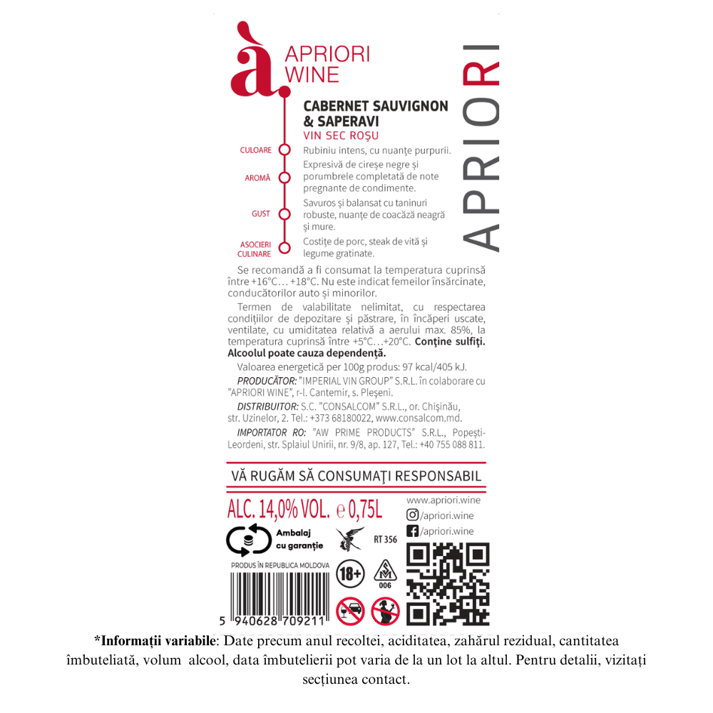 Vin rosu sec APRIORI Cabernet Sauvignon & Saperavi 0,75L