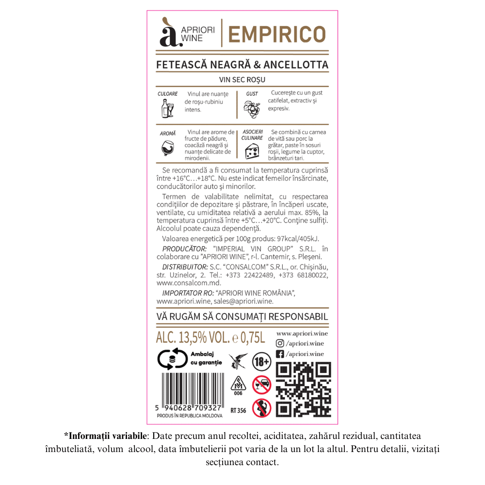 Vin rosu sec APRIORI EMPIRICO Feteasca Neagra & Ancelotta 0,75L