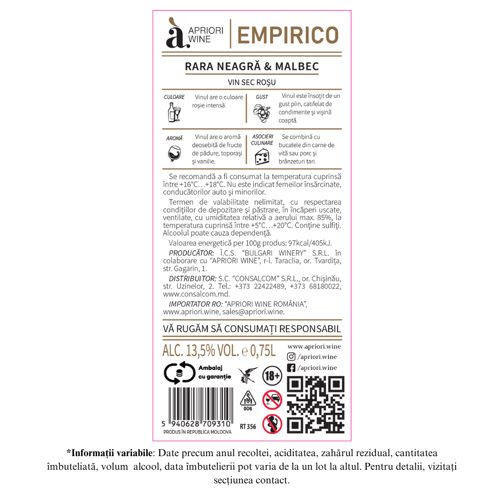 Vin roșu sec APRIORI EMPIRICO Rara Neagra & Malbec – ideal pentru tine și cei dragi!