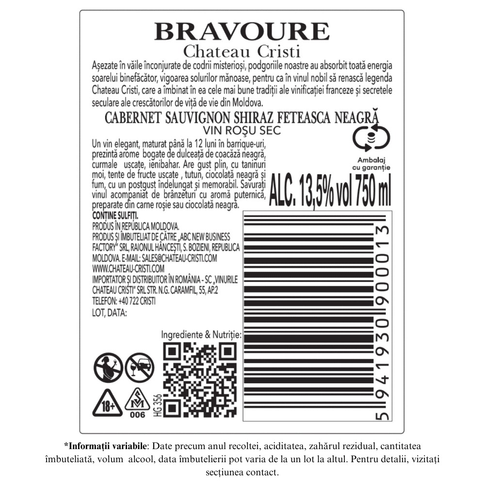 Vin Roșu Sec, Bravoure, Cabernet Sauvignon & Shiraz & Feteasca Neagra, Chateau Cristi