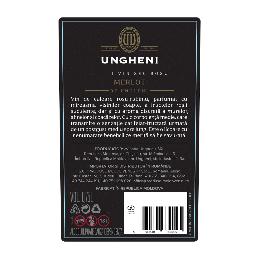 Acest vin roșu sec conține Merlot cules și produs la Vinăria Ungheni. Are o culoare puternică de roșu-rubiniu, parfumat cu mireasma vișinelor coapte și a fructelor roșii suculente.