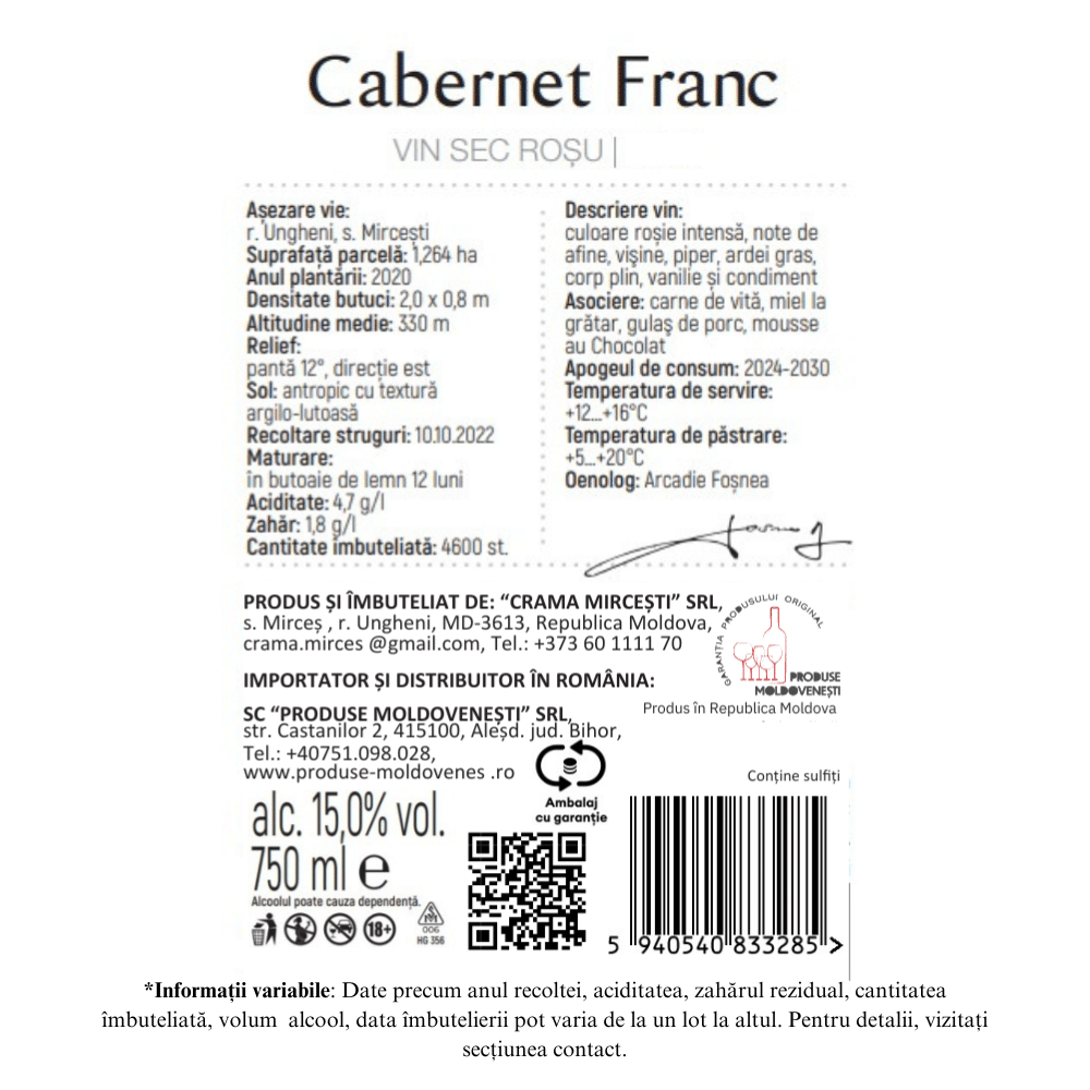 Vin roșu sec, 100% din strucuri selecți de Cabernet Franc. Vinul are o culoare roșie intensă, note de afine și ardei grași, corp plin, vanilie, și condimentat.