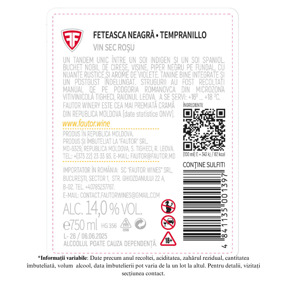 Un tandem unical intre un soi indigen si unul spaniol. Buchet nobil de cirese, visine, piper negru pe fundal cu nuante rustice si arome de violete. Tanine bine integrate si un post gust indelungat.