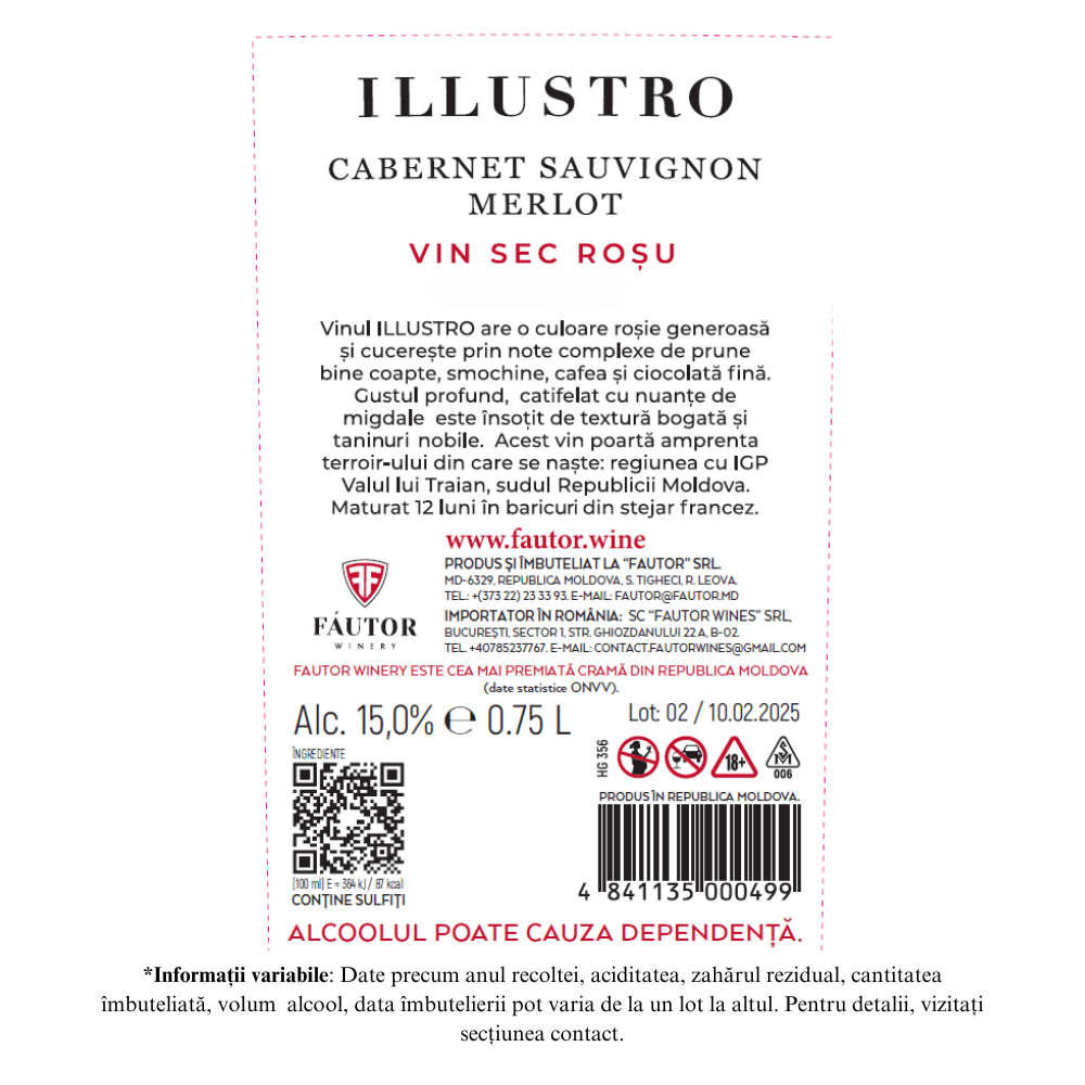 ILLUSTRO Cabernet Sauvignon – Merlot este un vin roșu sec de excepție, creat pentru a evidenția eleganța și forța a două soiuri nobile. Culoarea sa roșie intensă anticipează un buchet aromatic complex, dominat de prune coapte, vișine și smochine, completate de accente subtile de cafea proaspăt prăjită și ciocolată fină.