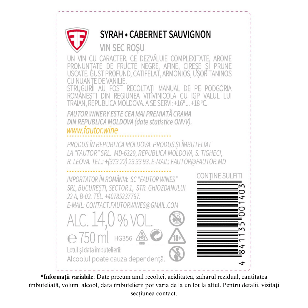 Un vin cu caracter, ce dezvăluie complexitate, arome pronunțate de fructe negre, afine, cireșe și prune uscate. Gust profund, catifelat, armonios, ușor taninos cu nuanțe de vanilie.
