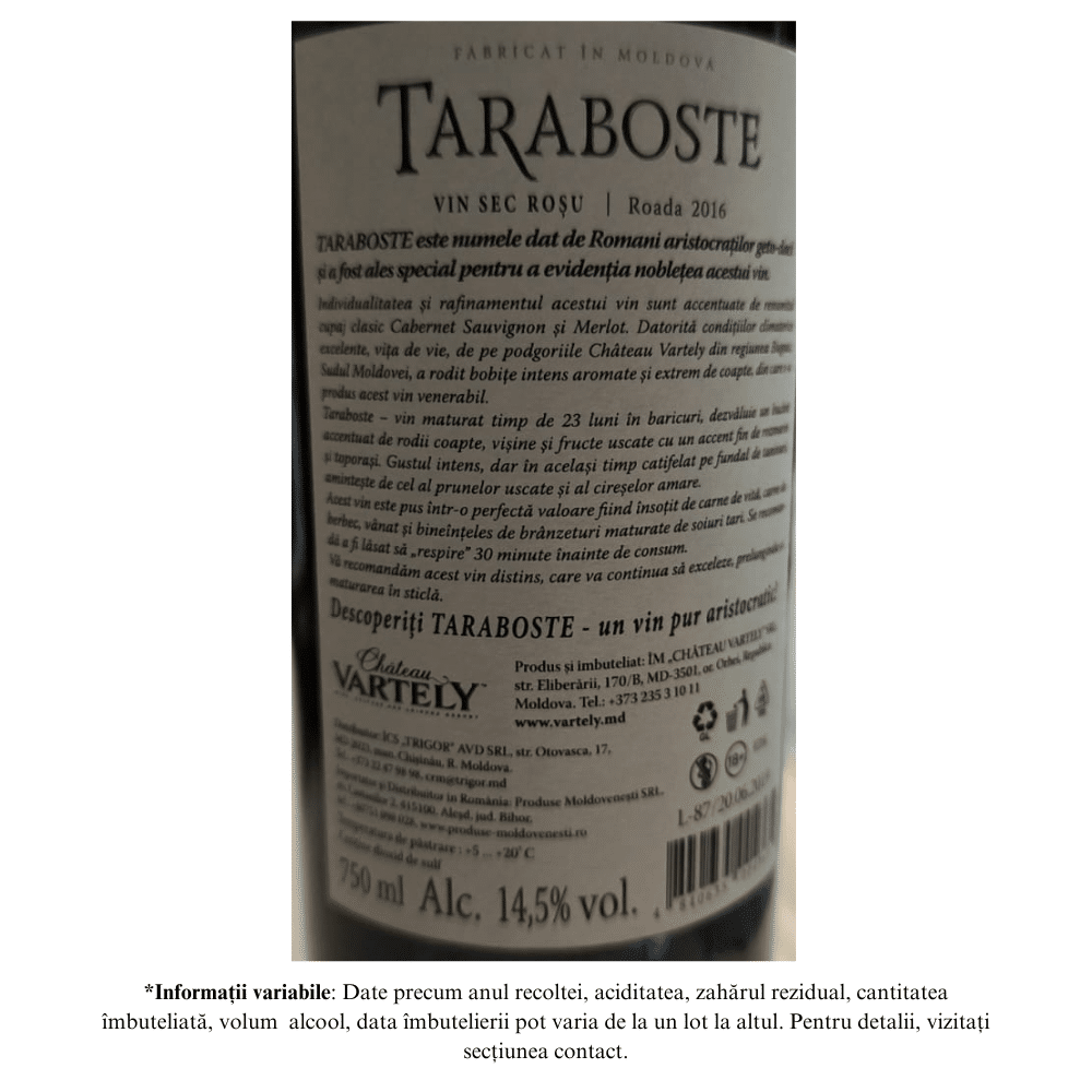 Vin rosu sec. Cabernet-Sauvignon & Merlot Taraboste 2016 este un vin exceptional, produs din struguri intens aromați și extrem de copți, recoltați de pe podgoriile Château Vartely din sudul Moldovei, zona Bugeac, și maturat timp de 18 luni în barrique-uri noi.