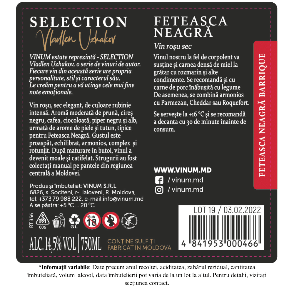 Vin roșu sec, bine structurat, cu arome de fructe roșii coapte, condimente fine și un final echilibrat.