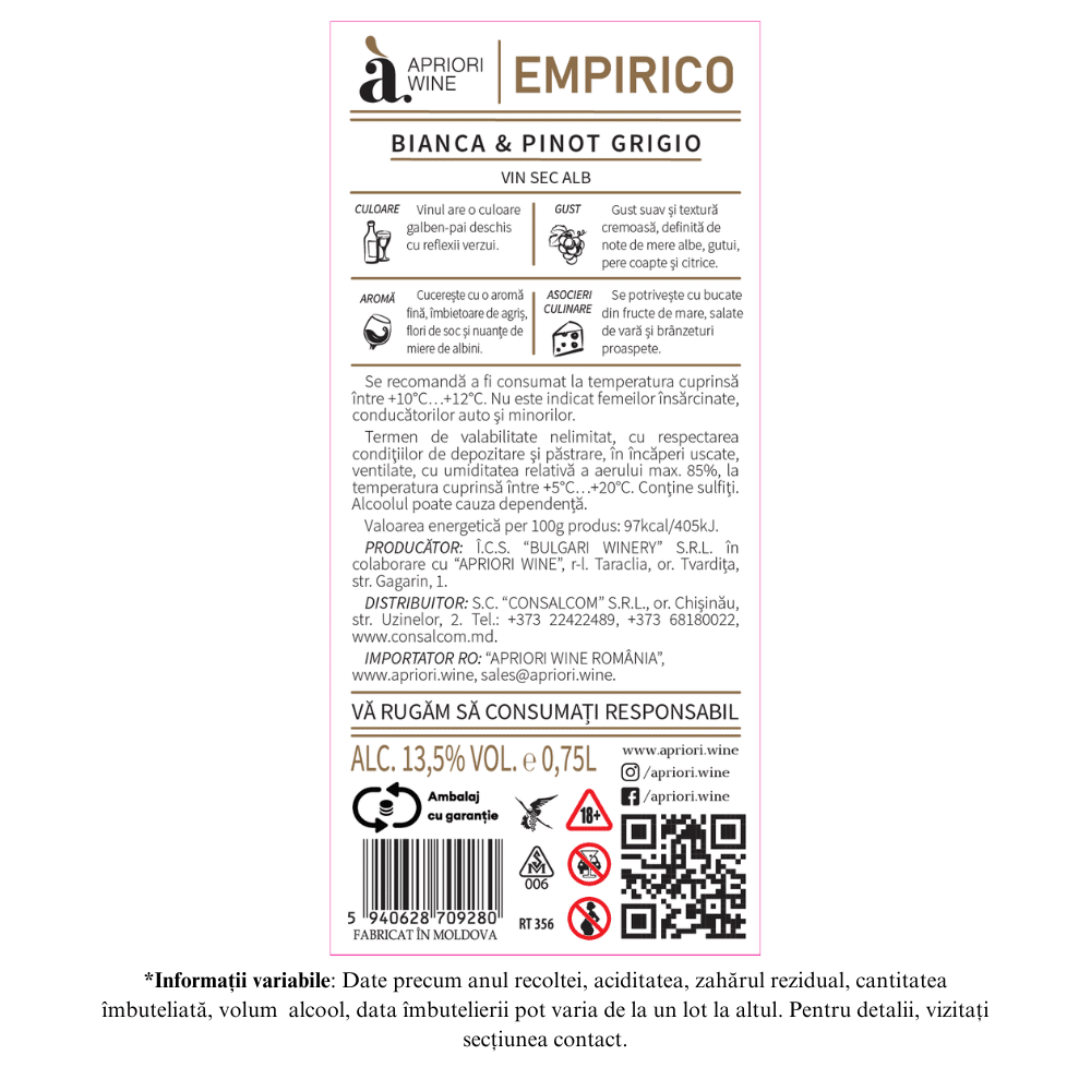 Vin sec alb Bianco & Pinot Grigio Empirico Apriori 0,75L