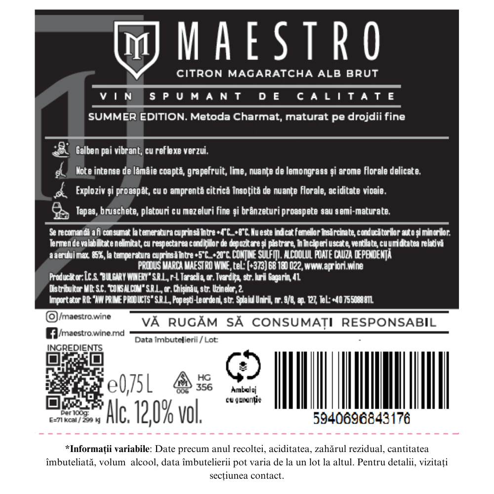 Buchetul vibrant, dominat de arome florale, se împletește armonios cu note de citrice coapte, pere suculente și fine accente exotice de busuioc și coriandru. Perlajul fin și persistent amplifică senzația de prospețime, iar gustul echilibrat, cu textură elegantă și mineralitate subtilă, dezvăluie un final lung, proaspăt și delicat condimentat.