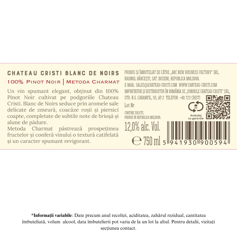 Chateau Cristi Blanc de Noirs este un vin spumant rafinat, obținut din struguri roșii