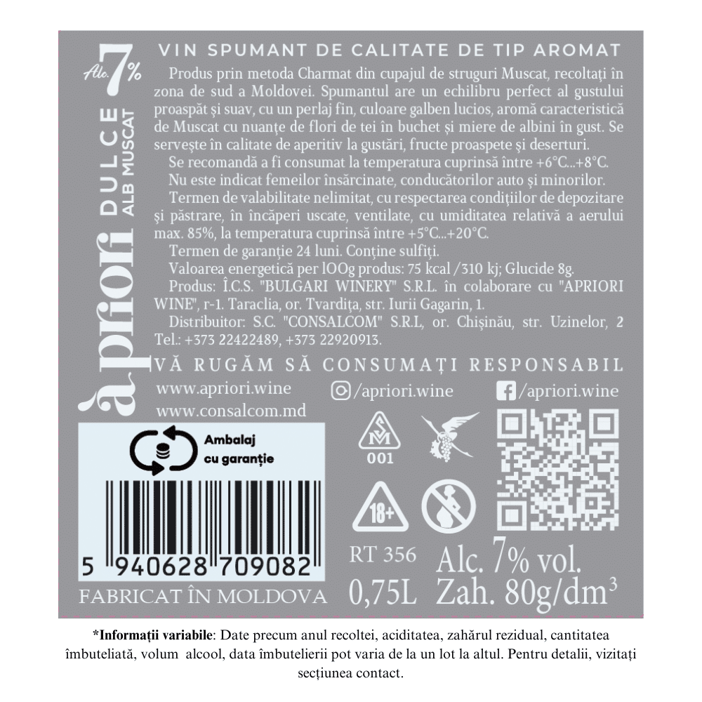 Vin Spumant aromat dulce alb APRIORI MUSCAT 0,75L
