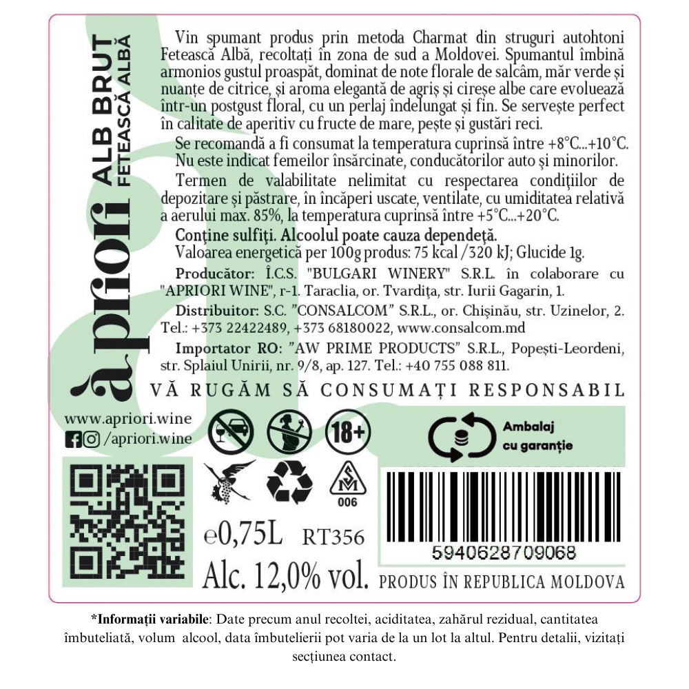 Vin Spumant Brut alb APRIORI FETEASCA ALBA 0,75L
